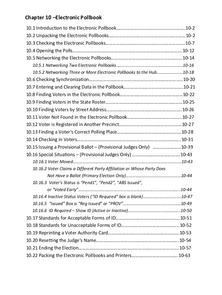 Chapter 10 Electronic Poll book 10.1 Introduction to the Electronic Poll book.102 10.2 Unpacking the Electronic Pollbooks102 10.3 Checking the Electronic Poll books.107 10.4 Opening the Polls.1012