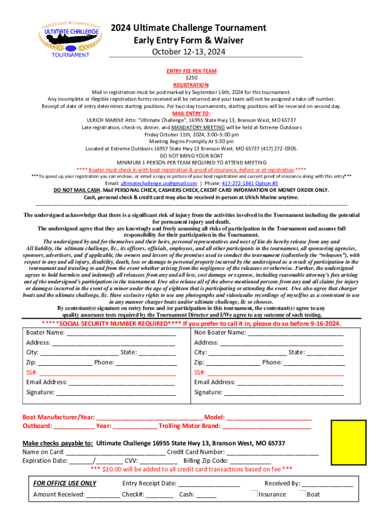 2024 Ultimate Challenge Tournament Early Entry Form & Waiver October 1213, 2024 ENTRY FEE PER TEAM $250 REGISTRATION: Mail in registration must be postmarked by September 16th, 2024 for this tournament.