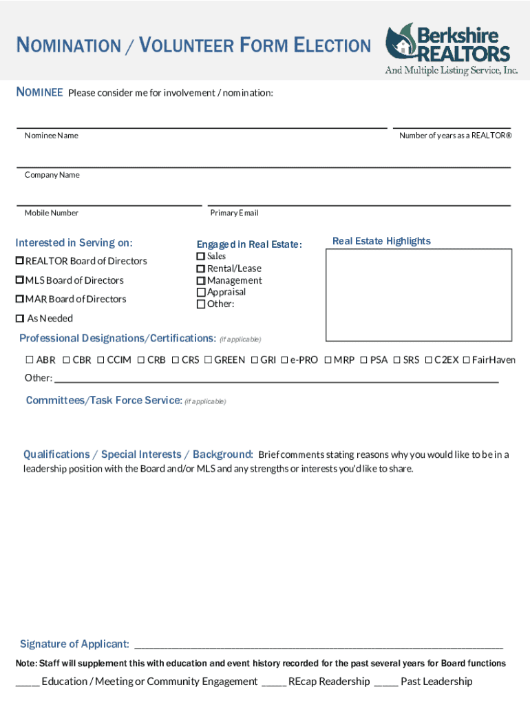 NOMINEEPlease consider me for involvement / nomination:Nominee Renumber of years as a REALTORCompany Name Mobile NumberInterested in Serving on: REALTOR Board