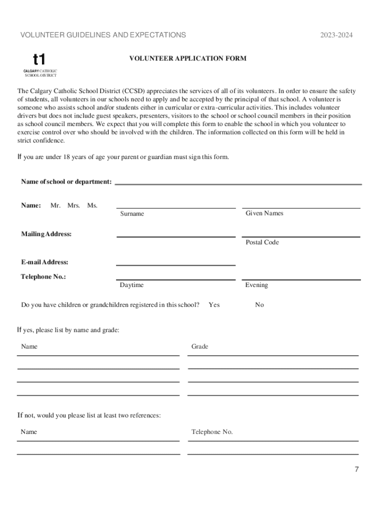 VOLUNTEER GUIDELINES AND EXPECTATIONSt120232024VOLUNTEER APPLICATION FORMULARY CATHOLICSCHOOL OISTRICTThe Calgary Catholic School District (CCD) appreciates the services of all of its volunteers.