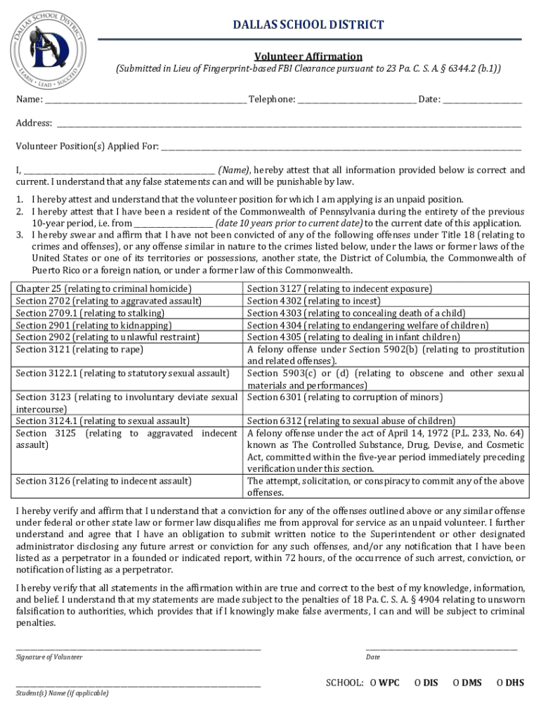 DALLAS SCHOOL DISTRICT Volunteer Affirmation(Submitted in Lieu of Fingerprint based FBI Clearance pursuant to 23 Pa. C. S. A. 6344.2 (b.1)) Name: ___ Telephone: ___ Date: ___ Address: ___ Volunteer
