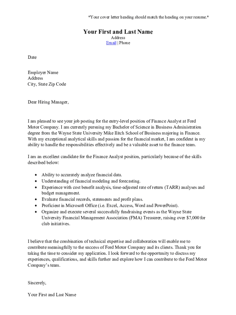 *Your cover letter heading should match the heading on your resume.×Your First and Last Name Address Email | PhoneD ate Employer Name Address City, State Zip Code Dear Hiring Manager, I am pleased