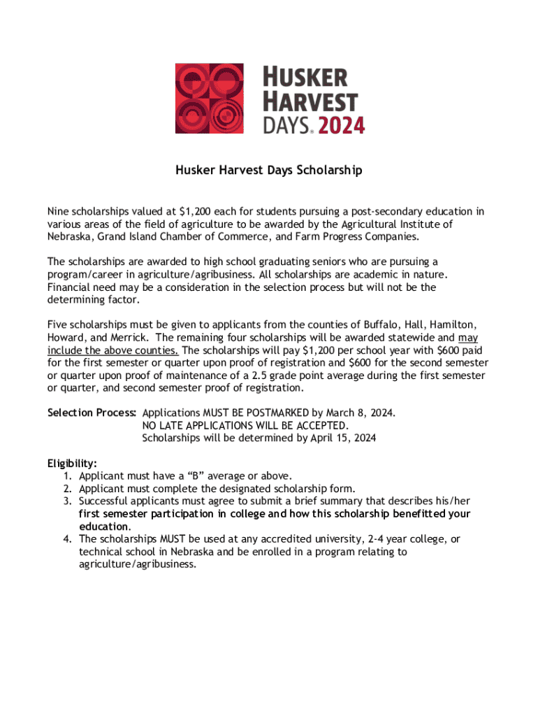 Husker Harvest Days Scholarship Nine scholarships valued at $1,200 each for students pursuing a postsecondary education in various areas of the field of agriculture to be awarded by the Agricultural