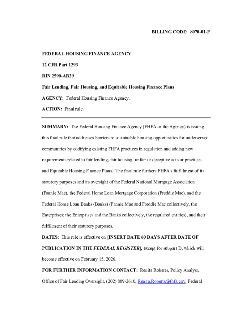BILLING CODE: 807001PFEDERAL HOUSING FINANCE AGENCY 12 CFR Part 1293 IN 2590AB29 Fair Lending, Fair Housing, and Equitable Housing Finance Plans AGENCY: Federal Housing Finance Agency. ACTION: Final