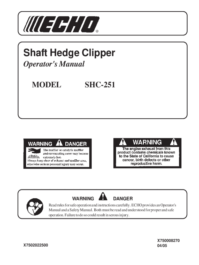 SHAFT HEDGE CLIPPER OPERATOR\'S MANUALS haft Hedge Clipper Operator\'s Manual MODELSHC251WARNINGDANGERRead rules for safe operation and instructions carefully. ECHO provides an Operator\'s Manual