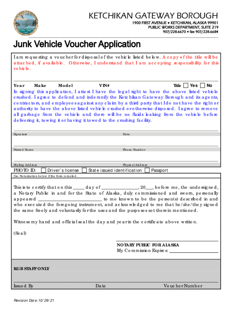 KETCHIKAN GATEWAY BOROUGH1900 FIRST AVENUE KETCHIKAN, ALASKA 99901 PUBLIC WORKS DEPARTMENT, SUITE 219 907/228.6670 fax 907/228.6684 ___I am requesting a voucher for disposal of the vehicle listed