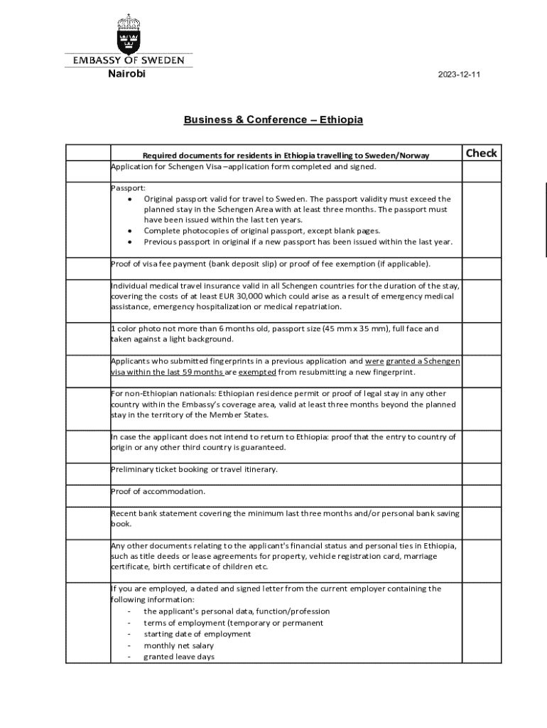 Nairobi20231211Business & Conference Ethiopia Required documents for residents in Ethiopia travelling to Sweden/Norway Application for Schengen Visa application form completed and signed. Passport: