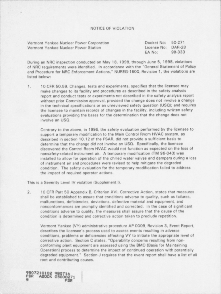 _ _ _.__.__._ _ _ _ __ _ _ _ _ _ _ _ _. _ _ _ _ _ __ _ _ _ _ _ _ .. _ _ _ _ _ _ _.NOTICE OF VIOLATIONVermont Yankee Nuclear Power Corporation Vermont Yankee Nuclear Power StationDocket No:50271License