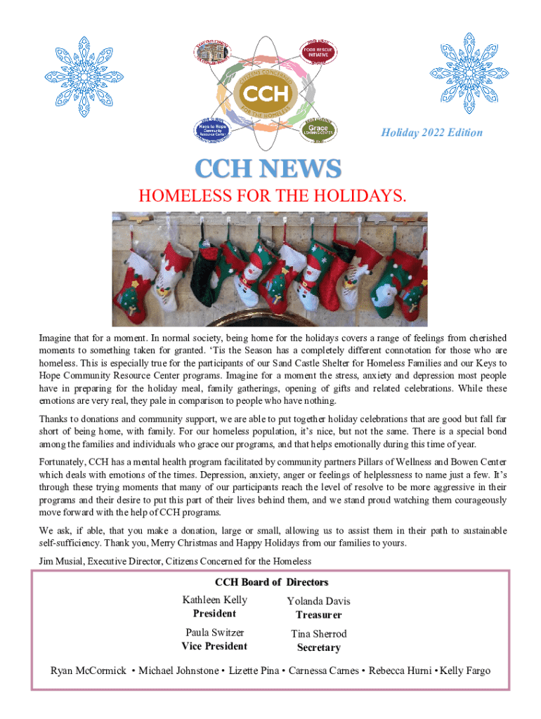 Holiday 2022 Edition CCH NEWS HOMELESS FOR THE HOLIDAYS. Imagine that for a moment. In normal society, being home for the holidays covers a range of feelings from cherished moments to something taken