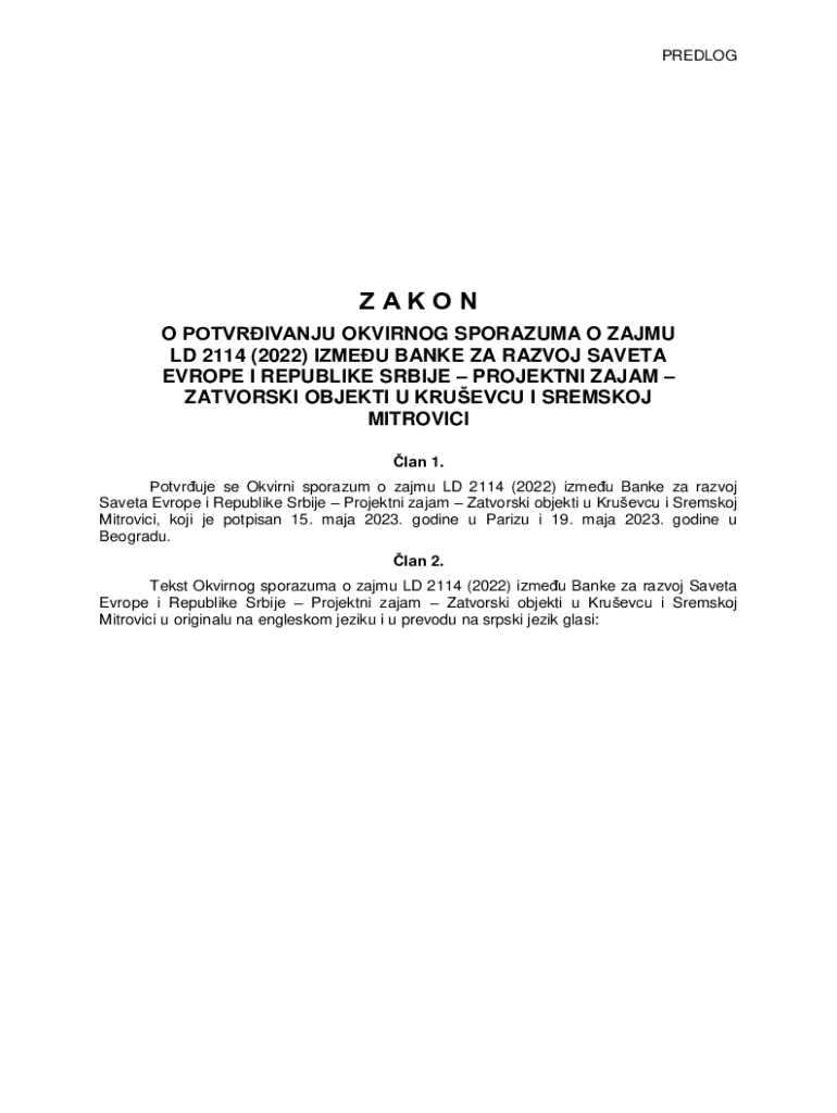 PREDLOGZAKON O POTVRIVANJU OKVIRNOG SPORAZUMA O ZAJMU LD 2114 (2022) IZMEU BANKE ZA RAZVOJ SAVETA EVROPE I REPUBLIKE SRBIJE PROJEKTNI ZAJAM ZATVORSKI OBJEKTI U KRUEVCU I SREMSKOJ MITROVICI lan 1.