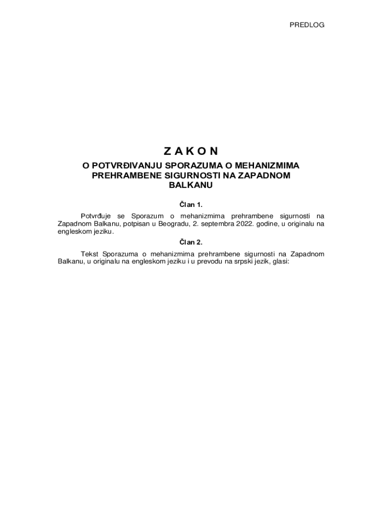 PREDLOGZAKON O POTVRIVANJU SPORAZUMA O MEHANIZMIMA PREHRAMBENE SIGURNOSTI NA ZAPADNOM BALKANU lan 1. Potvruje se Sporazum o mehanizmima prehrambene sigurnosti na Zapadnom Balkanu, potpisan u Beogradu,