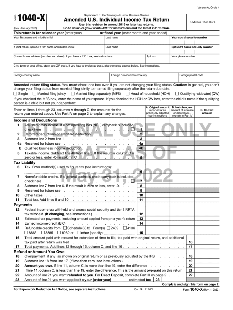 Conversion A, Cycle 41040X(Rev. January 2023)Department of the TreasuryInternal Revenue ServiceAmended U.S. Individual Income Tax Return OMB No. 15450074Use this revision to amend 2019 or later tax