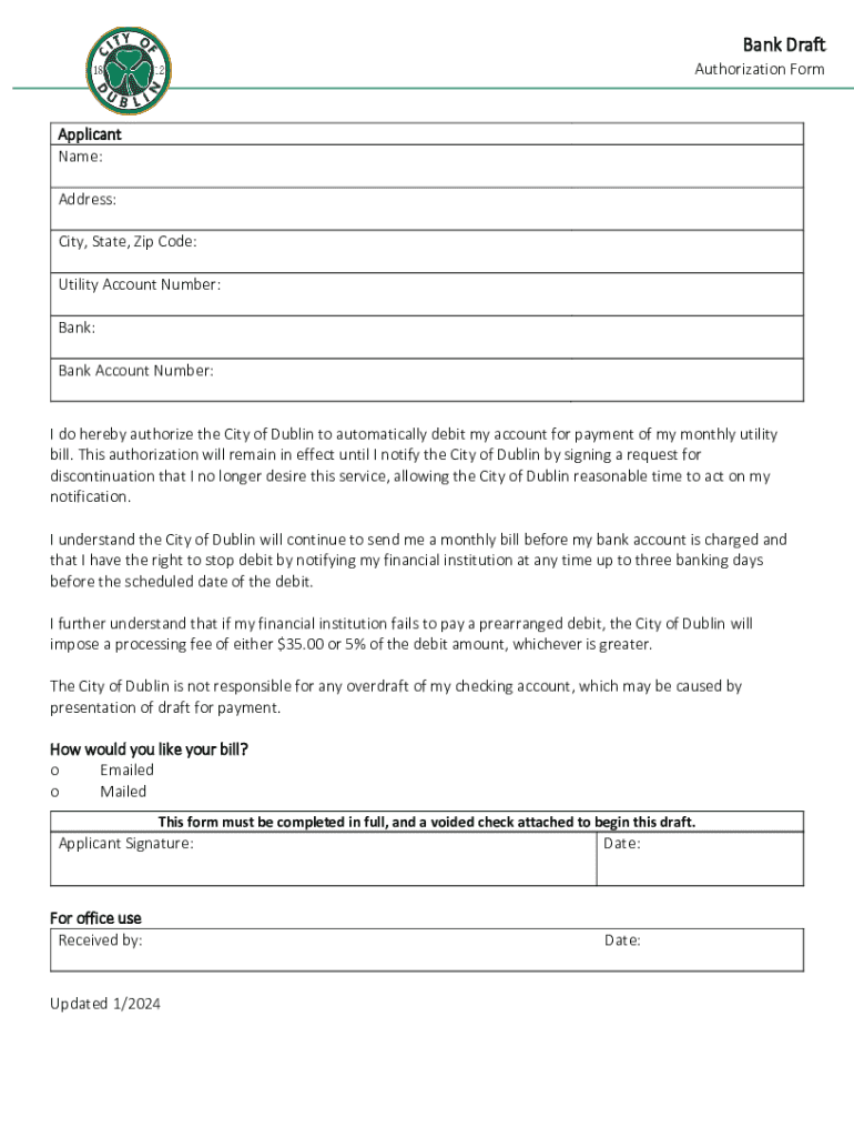Bank Account Number:I do hereby authorize the City of Dublin to automatically debit my account