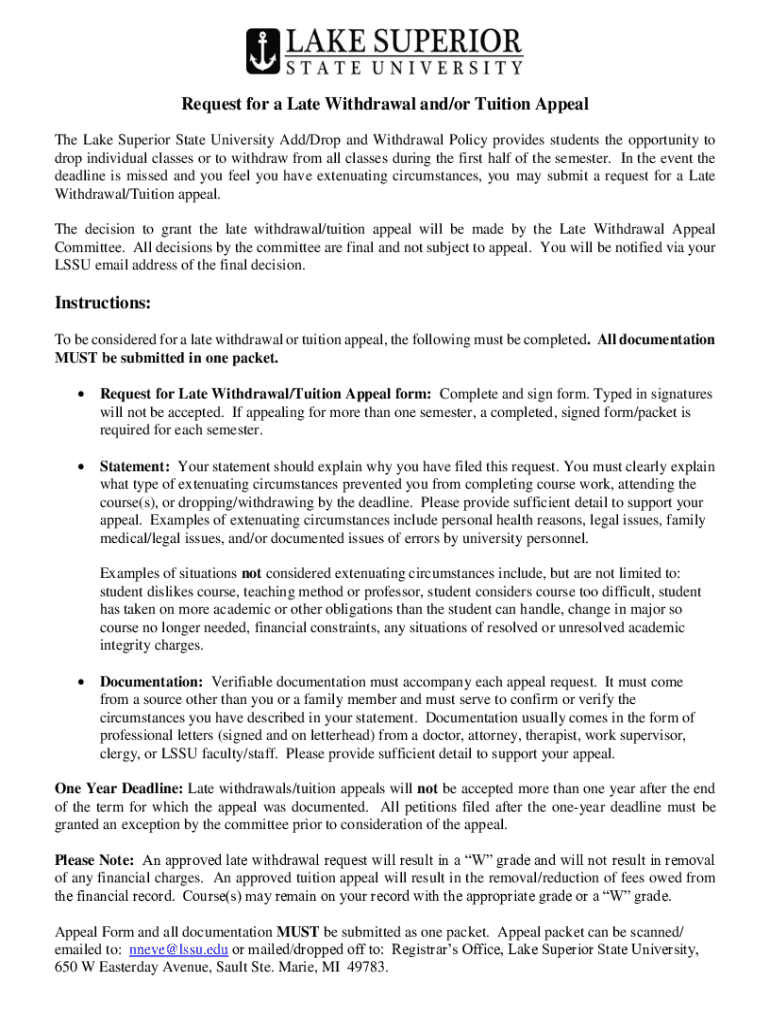 Request for a Late Withdrawal and/or Tuition Appeal The Lake Superior State University Add/Drop and Withdrawal Policy provides students the opportunity to drop individual classes or to withdraw from