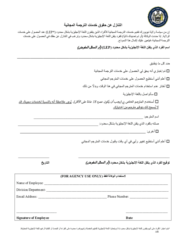 Complete the Limited English Proficiency (LEP) form with the individual's information and preferred language.