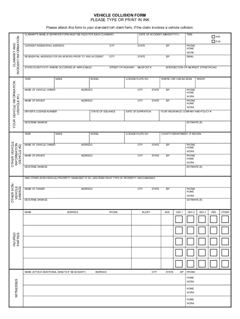 A vehicle collision form is a document used to report details of an accident involving one or more vehicles. It typically includes information about the participants, the vehicles involved, and the circumstances surrounding the collision.