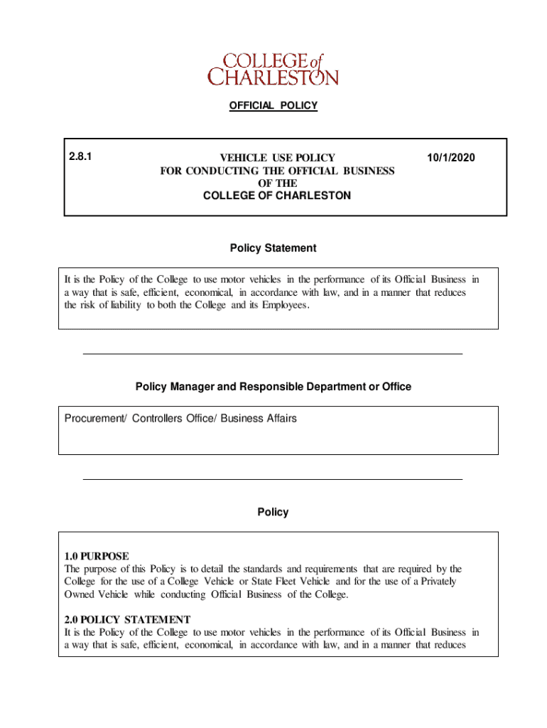 OFFICIAL POLICY2.8.1VEHICLE USE POLICY FOR CONDUCTING THE OFFICIAL BUSINESS OF THE COLLEGE OF CHARLESTON10/1/2020Policy Statement It is the Policy of the College to use motor vehicles in the performance