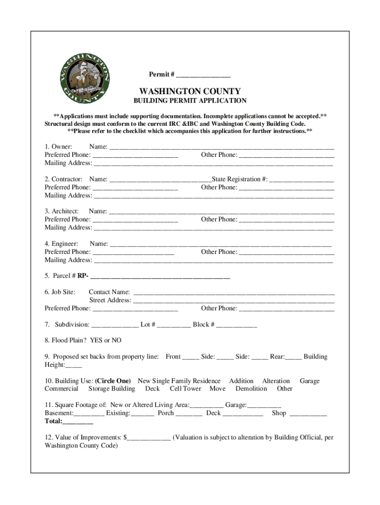 Permit # ___WASHINGTON COUNTY BUILDING PERMIT APPLICATION **Applications must include supporting documentation. Incomplete applications cannot be accepted.** Structural design must conform to the