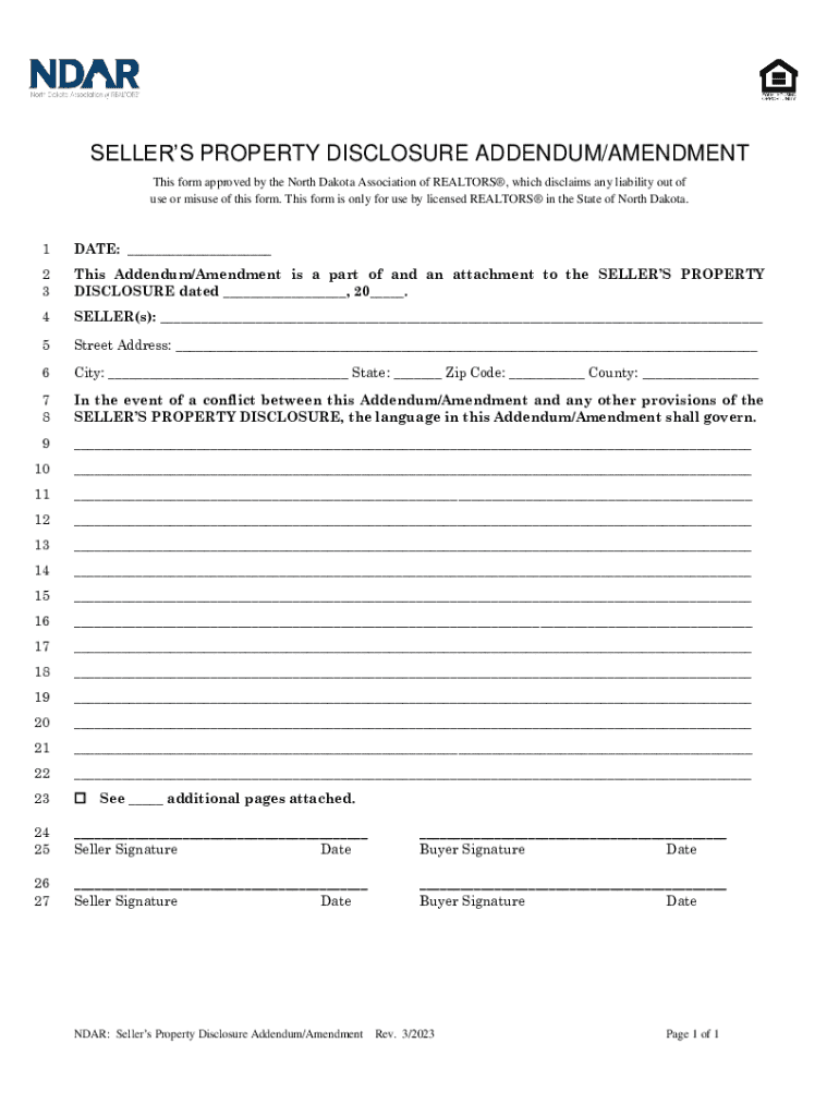 SELLERS PROPERTY DISCLOSURE ADDENDUM/AMENDMENT This form approved by the North Dakota Association of REALTORS, which disclaims any liability out of use or misuse of this form. This form is only for