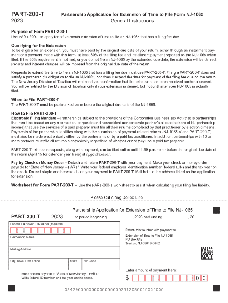PART200T2023Partnership Application for Extension of Time to File Form NJ1065General InstructionsPurpose of Form PART200TUse PART200T to apply for a five month extension of time to file an NJ1065
