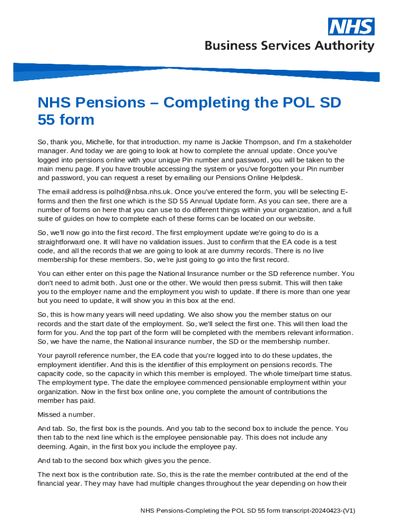 What is NHS Pensions-Completing the POL SD 55 transcript Form?