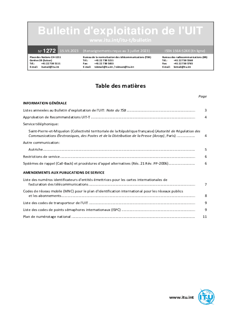 Bulletin d\'exploitation de l\'UIT www.itu.int/itut/bulletin No 127215.VII.2023Place des Nations CH1211 Genve 20 (Suisse) Tl.: +41 22 730 5111 Email: itumail@itu.int(Renseignements reus au 3 juillet