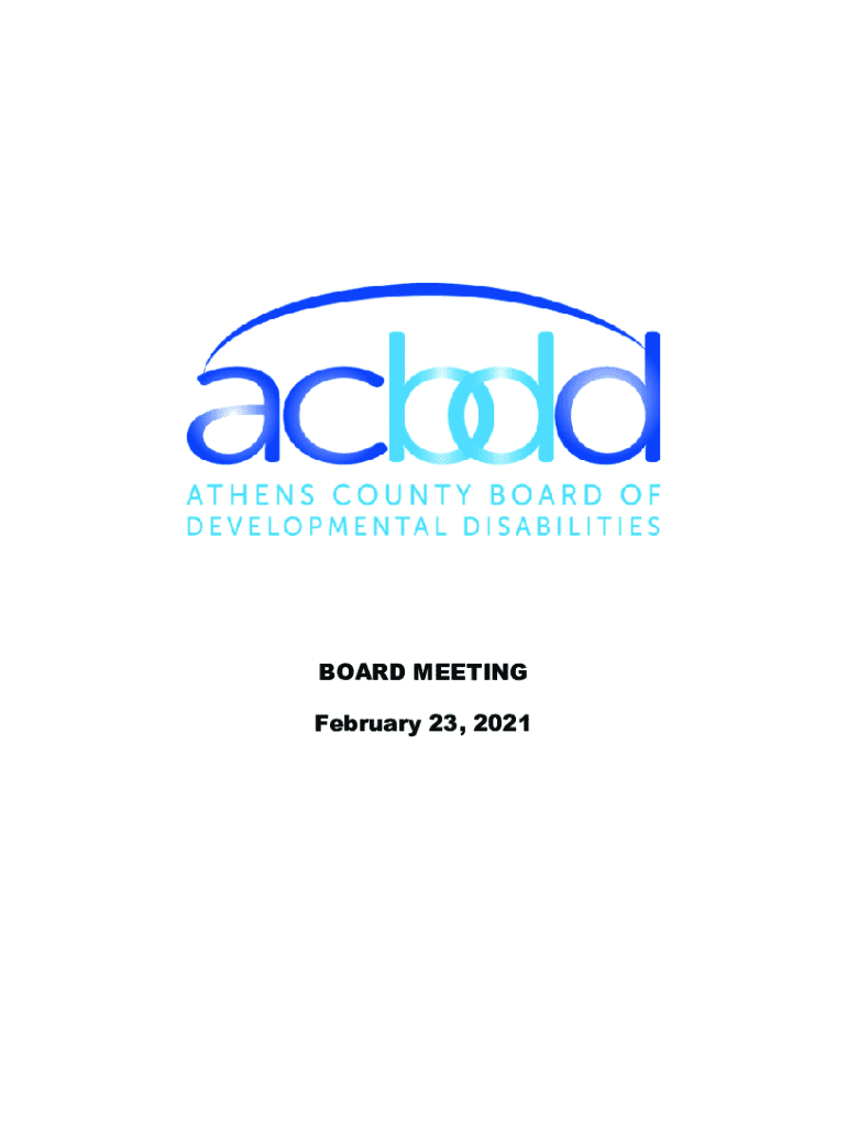 BOARD MEETING February 23, 2021February Board Meeting Agenda Tuesday, February 23, 2021 6:00 p.m. Remotely via Zoom The Mission of the Athens County Board of Developmental Disabilities is to serve