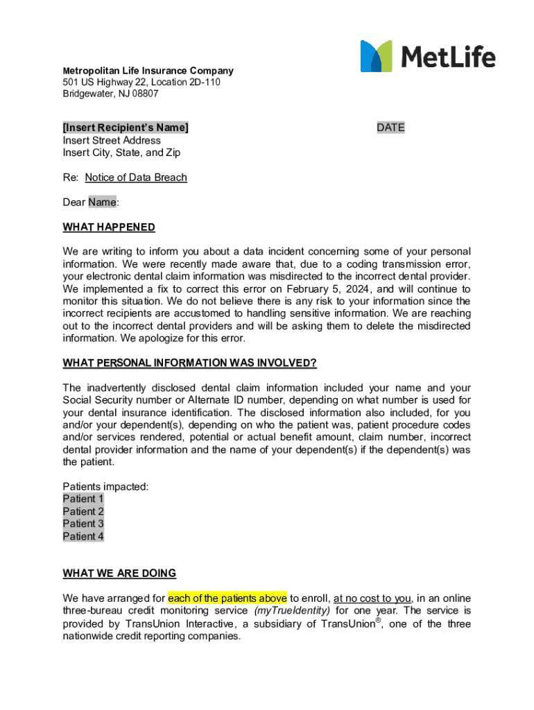 Metropolitan Life Insurance Company501 US Highway 22, Location 2D110 Bridgewater, NJ 08807[Insert Recipients Name] Insert Street Address Insert City, State, and ZipDATERe: Notice of Data Breach Dear