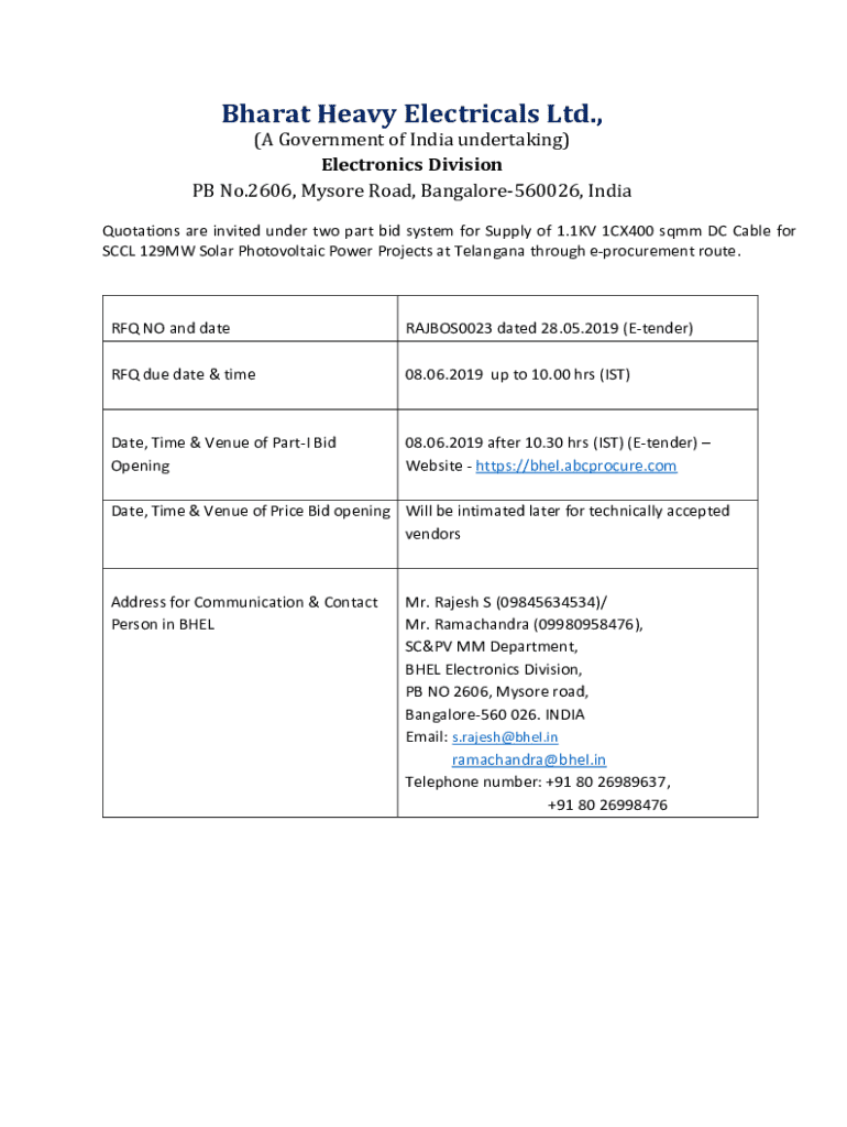 Bharat Heavy Electrical Ltd., (A Government of India undertaking) Electronics Division PB No.2606, Mysore Road, Bangalore560026, India Quotations are invited under two part bid system for Supply of
