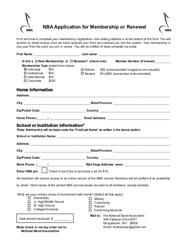 NBA Application for Membership or Renewal Print and mail to complete your membership registrationthe mailing address is at the bottom of this form. You will receive an email receipt once we have received