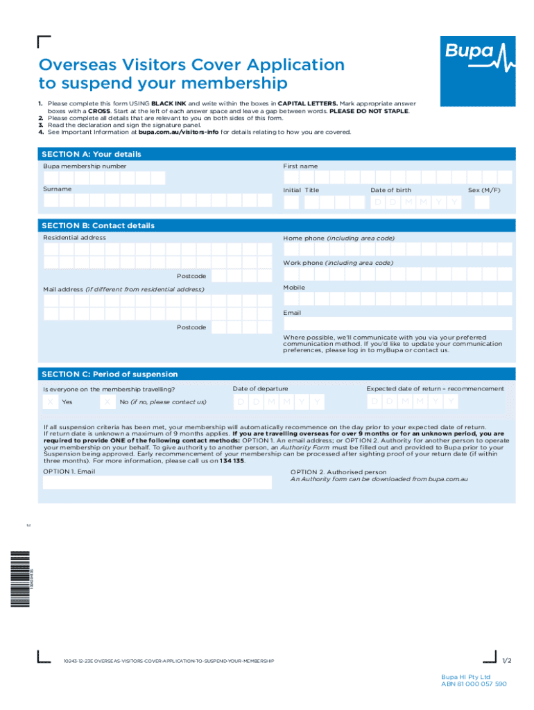 Overseas Visitors Cover Application to suspend your membership 1. Please complete this form USING BLACK INK and write within the boxes in CAPITAL LETTERS. Mark appropriate answer boxes with a CROSS.