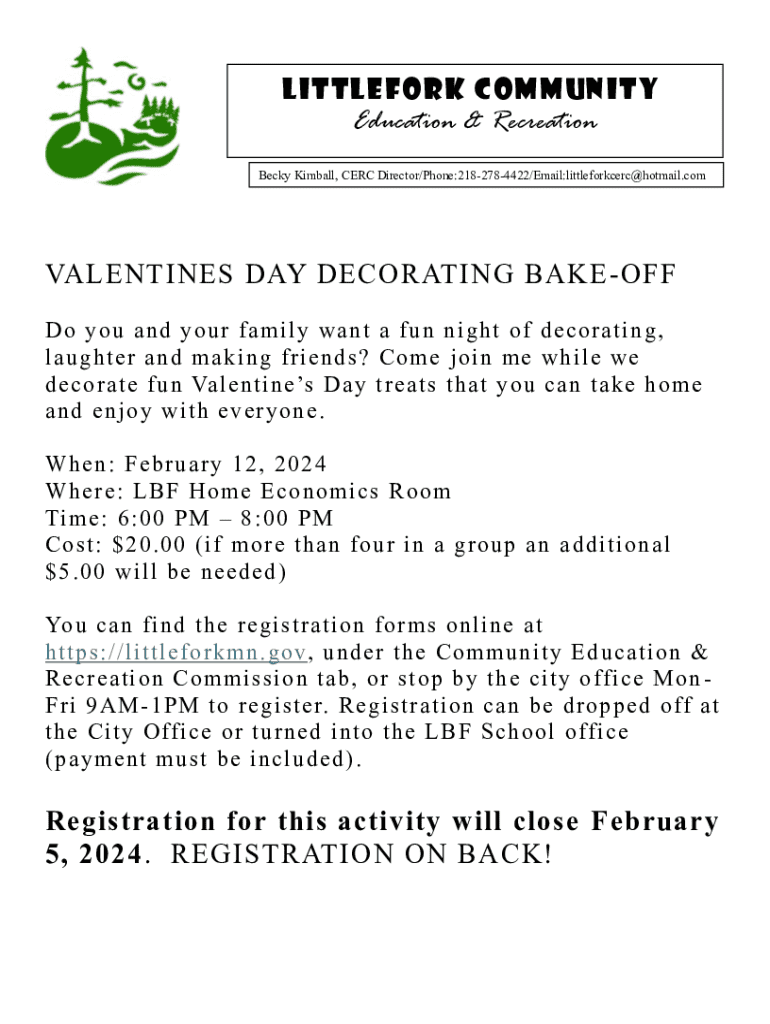 Littlefork Community Education & Recreation Becky Kimball, CERC Director/Phone:2182784422/Email:littleforkcerc@hotmail.comVALENTINES DAY DECORATING BAKE OFF Do you and your famil y wa nt a fun ni