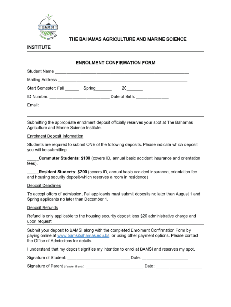 THE BAHAMAS AGRICULTURE AND MARINE SCIENCE INSTITUTE ENROLMENT CONFIRMATION FORM Student Name ___ Mailing Address ___ Start Semester: Fall ___Spring___20___ID Number: ___ Date of Birth: ___ Email: