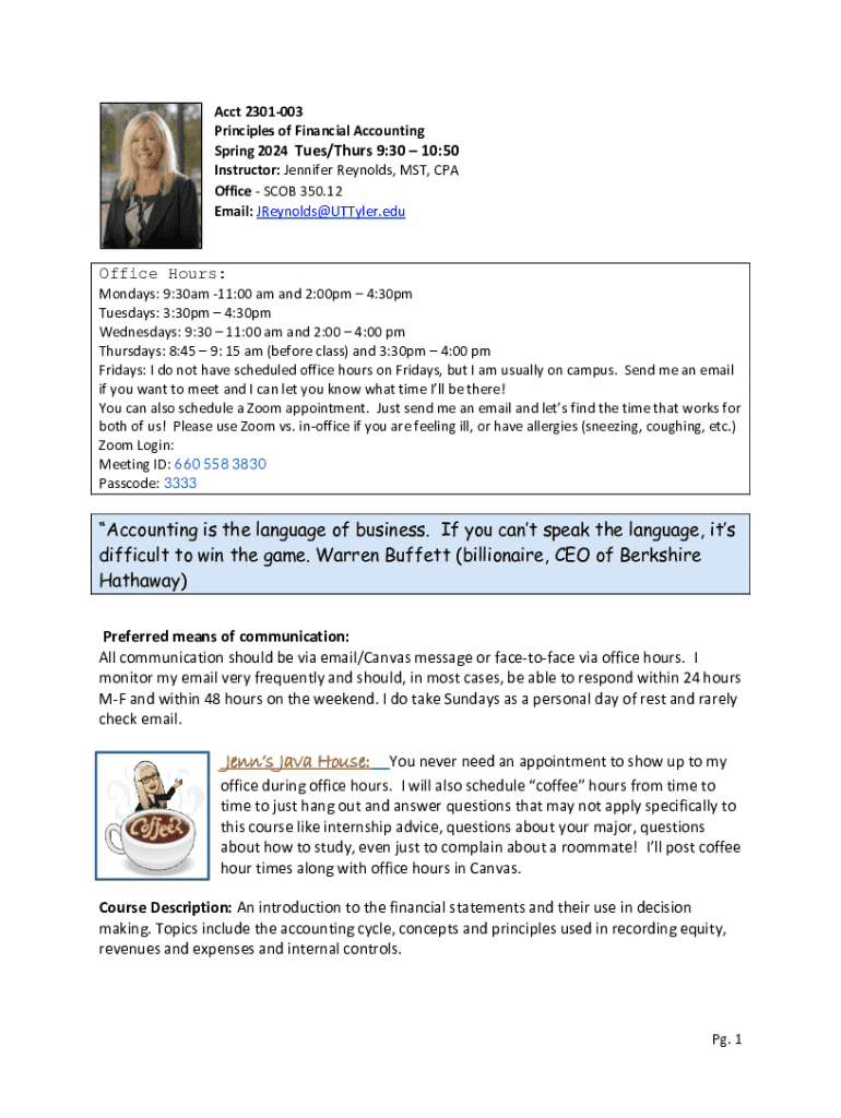 Acct 2301003 Principles of Financial Accounting Spring 2024 Tues/Thurs 9:30 10:50 Instructor: Jennifer Reynolds, MST, CPA Office SCOB 350.12 Email: JReynolds@UTTyler.eduOffice Hours: Mondays: 9:30am