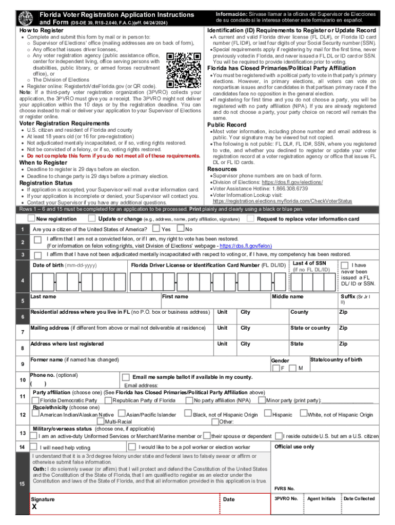 Florida Voter Registration Application Instructions and Form (DSDE 39, R1S2.040, F.A.C.)(eff. 04/24/2024)How to Register Complete and submit this form by mail or in person to: o Supervisor of Elections