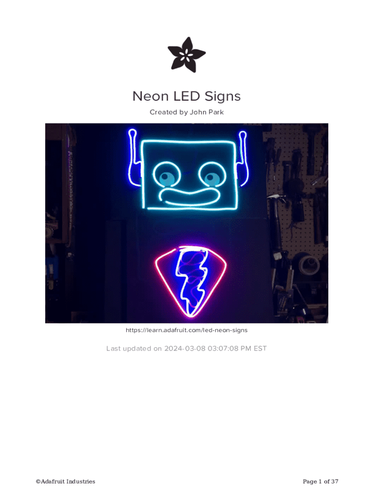 Neon LED Signs Created by John Parkhttps://learn.adafruit.com/ledneonsignsLast updated on 20240308 03:07:08 PM ESTAdafruit IndustriesPage 1 of 37Table of Contents Overview3 Parts Materials ToolsBuild