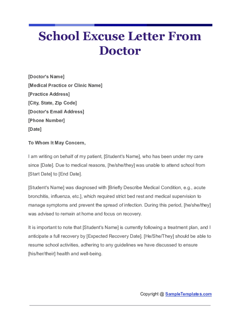 School Excuse Letter From Doctor [Doctor\'s Name] [Medical Practice or Clinic Name] [Practice Address] [City, State, Zip Code] [Doctor\'s Email Address] [Phone Number] [Date] To Whom It May Concern,