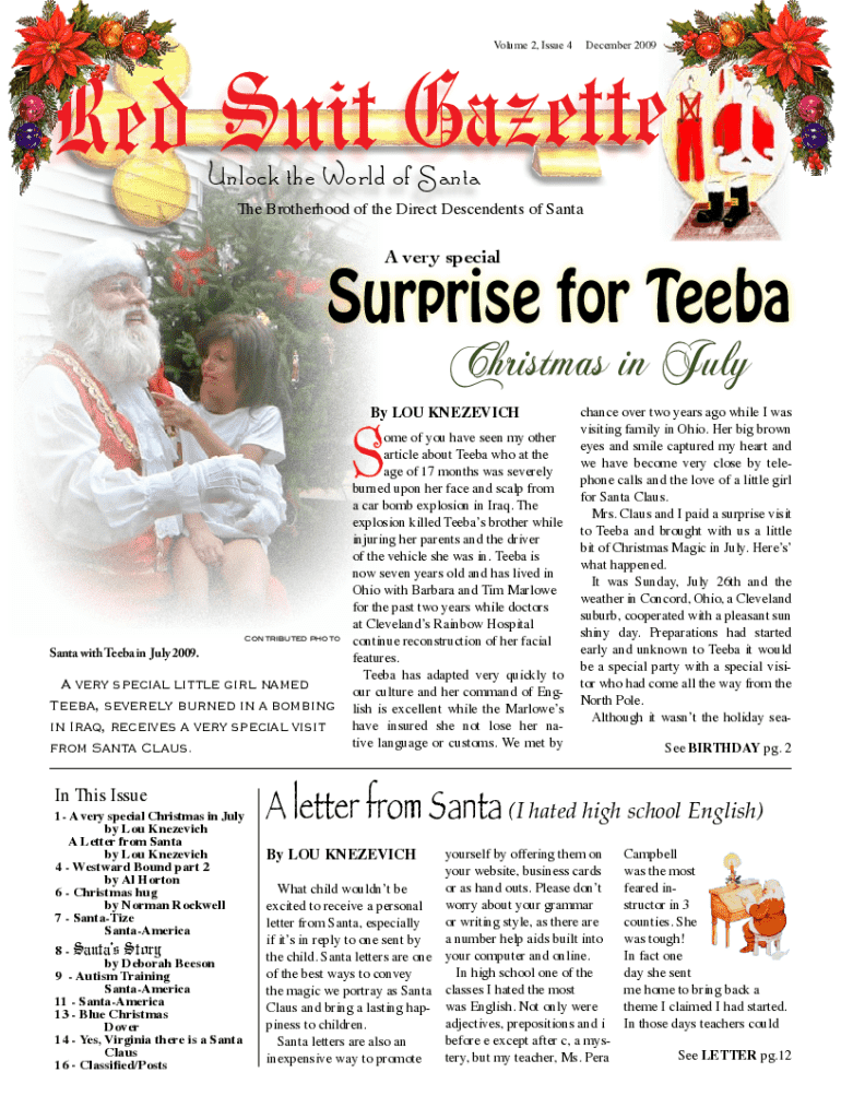 Volume 2, Issue 4December 2009Red Suit Gazette Unlock the World of SantaThe Brotherhood of the Direct Descendents of SantaA very specialSurprise for Teeba Christmas in JulyBy LOU KNEZEVICHS Contributed
