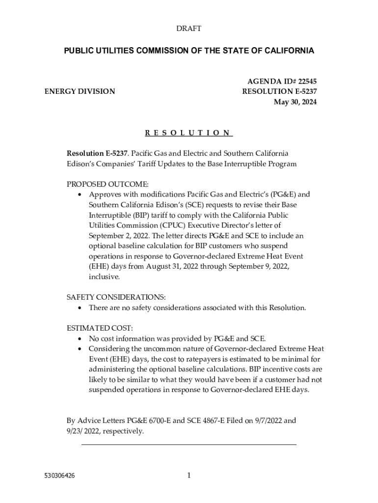 DRAFTPUBLIC UTILITIES COMMISSION OF THE STATE OF CALIFORNIA AGENDA ID# 22545 RESOLUTION E5237 May 30, 2024ENERGY DIVISIONR E S O L U T I O N Resolution E5237. Pacific Gas and Electric and Southern