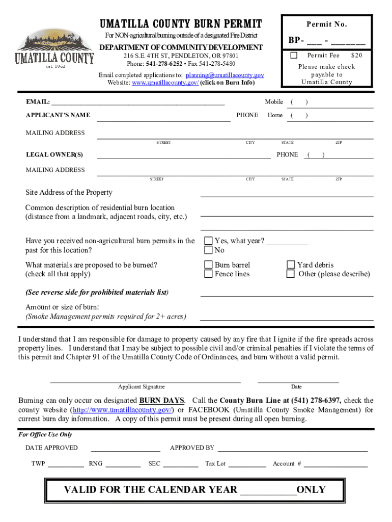 UMATILLA COUNTY BURN PERMITPermit No.For NONagricultural burning outside of a designated Fire DistrictBP ___ ___DEPARTMENT OF COMMUNITY DEVELOPMENTPermit Fee216 S.E. 4TH ST, PENDLETON, OR 97801 Phone: