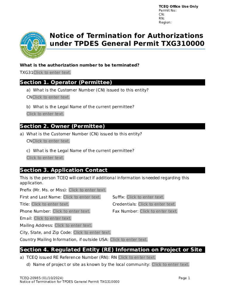 How to fill out Notice of Termination (NOT) TXG 31. NOT under TPDES General Permit TXG110000