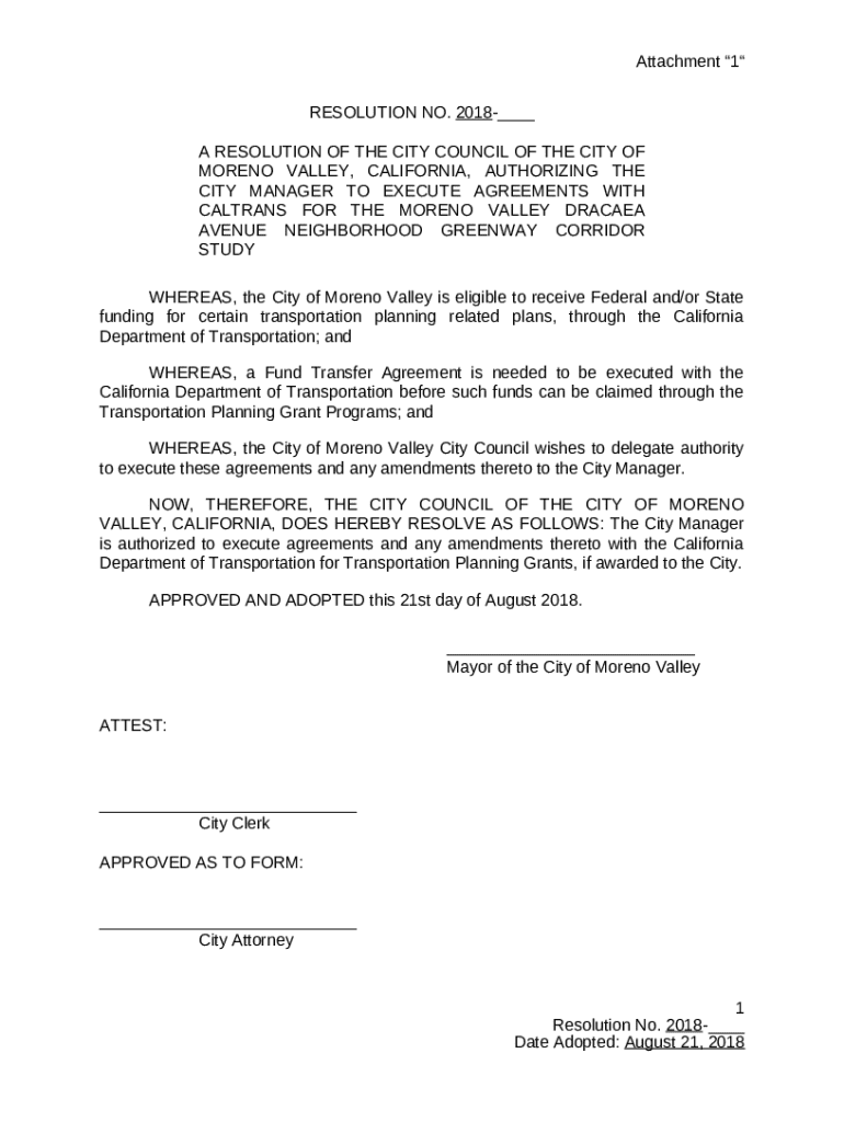 What is A RESOLUTION OF THE CITY COUNCIL OF THE CITY OF MORENO VALLEY, CALIFORNIA, AUTHORIZING THE CITY MANAGER TO EXECUTE AGREEMENTS WITH CALTRANS FOR THE MORENO VALLEY DRACAEA AVENUE NEIGHBORHOOD GREENWAY CORRIDOR STUDY - moreno-valley ca Form?