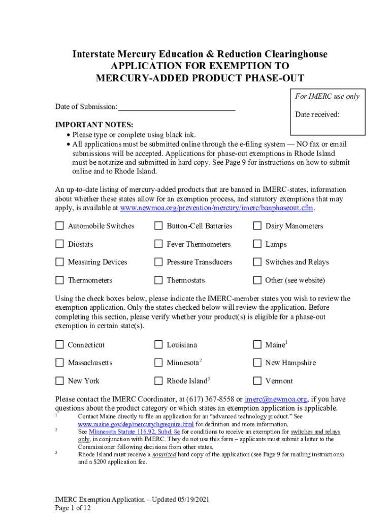 Interstate Mercury Education & Reduction Clearinghouse APPLICATION FOR EXEMPTION TO MERCURYADDED PRODUCT PHASEOUT For IMERC use onlyDate of Submission:Date received:IMPORTANT NOTES: Please type or