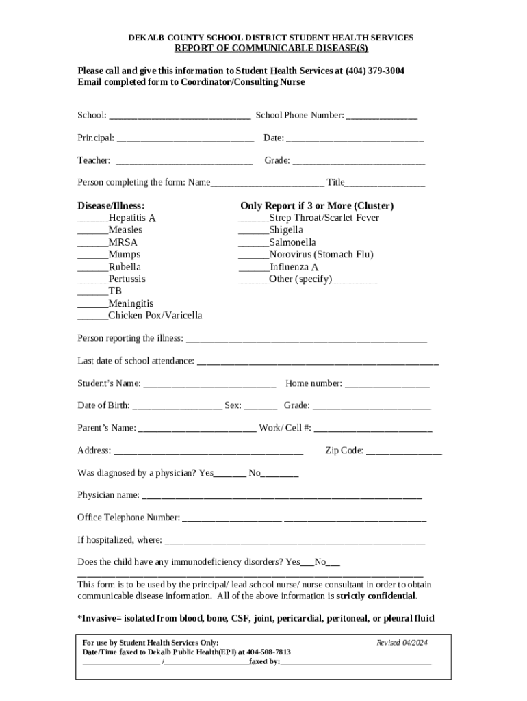 The Communicable Disease Case and Outbreak Toolkit for ... is a writable document required to be submitted to the specific address to provide some information. It must be filled-out and signed, which is possible manually, or with a particular software like PDFfiller. It allows to fill out any PDF or Word document directly in your browser, customize it according to your purposes and put a legally-binding e-signature. Once after completion, you can send the Communicable Disease Case and Outbreak Toolkit for ... to the appropriate individual, or multiple recipients via email or fax. The template is printable as well because of PDFfiller feature and options presented for printing out adjustment. In both digital and physical appearance, your form will have got clean and professional appearance. It's also possible to save it as the template for later, so you don't need to create a new document over and over. All that needed is to edit the ready sample.