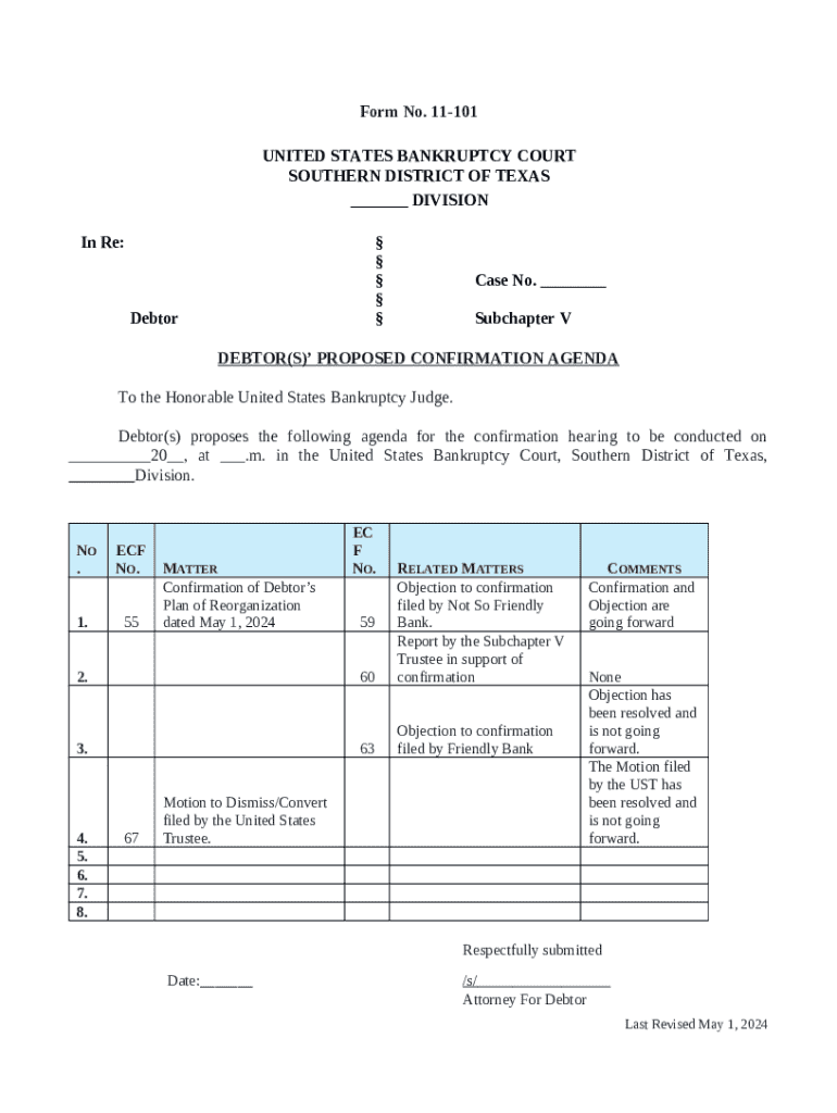 What is debtor(s) proposed CONFIRMATION agenda Form?