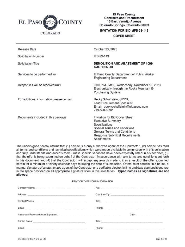 COVER SHEETRelease Date October 23, 2023Solicitation NumberIFB23143Solicitation