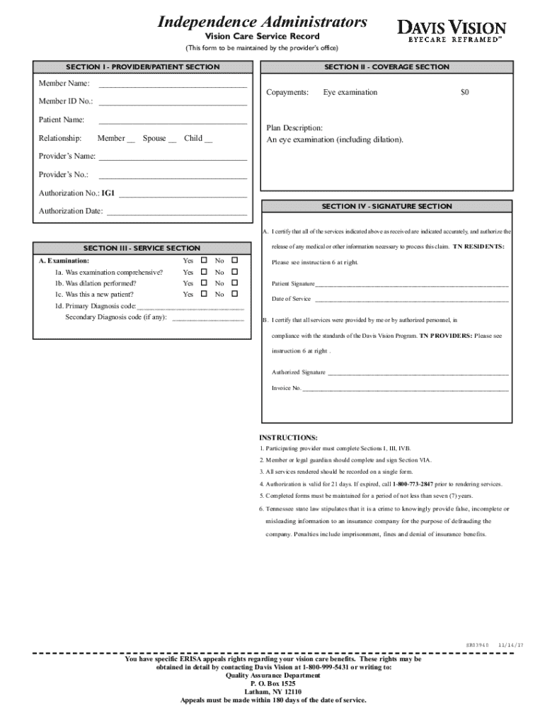 Vision Care Service Record(This form to be maintained by the providers' office)SECTION I PROVIDER/PATIENT SECTIONMember Name:___Patient Name:___Member ID No.: ___