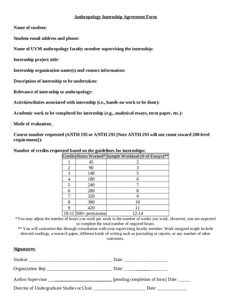 The Anthropology Internship Agreement Name of student is a writable document that can be completed and signed for specified purpose. Then, it is provided to the relevant addressee in order to provide specific details and data. The completion and signing can be done manually or via a suitable solution like PDFfiller. These tools help to send in any PDF or Word file without printing out. While doing that, you can edit it for your needs and put a valid digital signature. Once finished, you send the Anthropology Internship Agreement Name of student to the respective recipient or several ones by mail and even fax. PDFfiller has a feature and options that make your Word template printable. It provides different options for printing out appearance. It does no matter how you will distribute a document - physically or by email - it will always look well-designed and clear. To not to create a new editable template from scratch all the time, make the original form into a template. After that, you will have a rewritable sample.