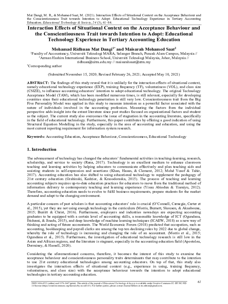Mat Dang, M. R., & Mohamed Seat, M. (2021). Interaction Effects of Situational Context on the Acceptance Behavior and