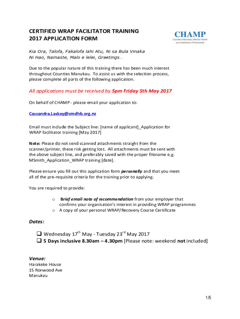 CERTIFIED WRAP FACILITATOR TRAINING2017 APPLICATION Formula Ora, Tacoma, Falloff AHI ATU, Ni SA Bulk Pinata